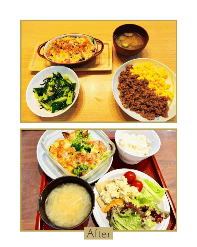コース受講前は献立を考えることが苦痛で、週末に1週間分をまとめ買いしていても買い忘れが多く毎日のように買い物をしてしまい、食材の把握ができていないことに悩んでいました。また、帰宅後に疲れた体で急いで料理するのが辛く、ご飯作りが嫌でたまらなくなっていました。