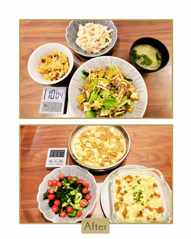 受講したことで、夕飯作りが60分で2品から、15〜20分で3〜4品でできるようになりました。